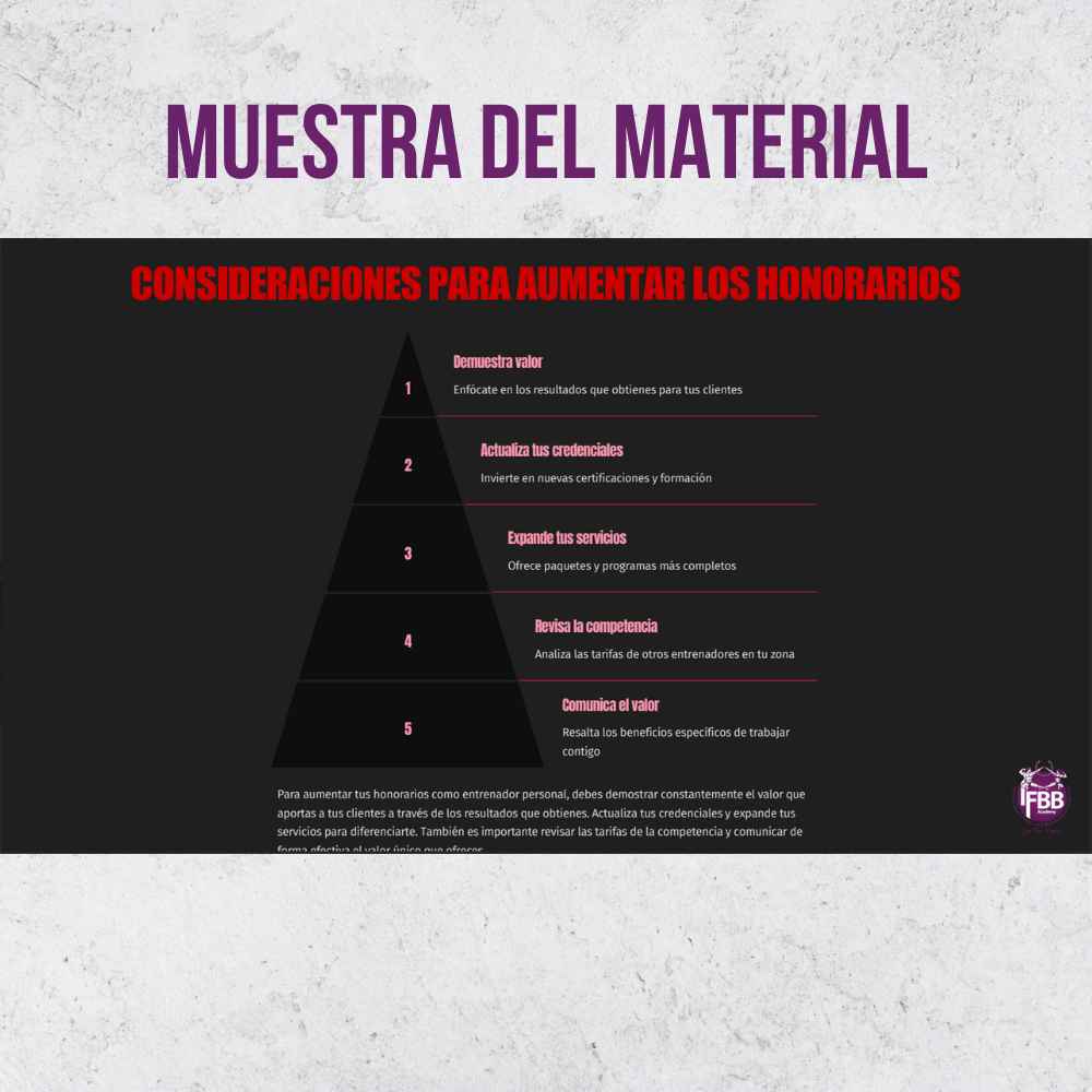 Este curso forma parte del programa oficial de la IFBB Academy Argentina y está orientado a entrenadores personales, coaches, estudiantes y profesionales del fitness que buscan aprender a establecer honorarios justos y competitivos para crecer en el mercado.