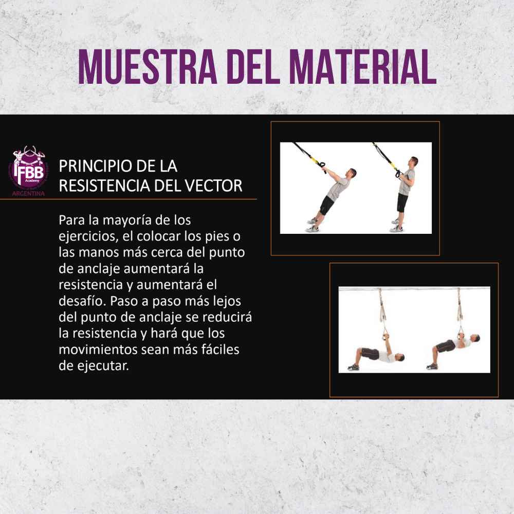 Durante la capacitación se abordan la historia y fundamentos del TRX, sus principios de aplicación (resistencia del vector, péndulo y estabilidad), así como progresiones de ejercicios para fuerza, hipertrofia, resistencia y flexibilidad.
